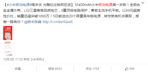 在一周年之际,小米在官方微博上为该 10400mAh 版移动电源庆生,同时还特别推出了它的一周年纪念版。