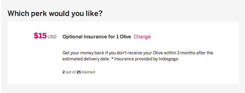 Indiegogo 表示,在这项保险的保护下,如果项目公司在承诺日期的三个月内没有交付产品,该项目的投资人就会收到赔偿。现在,Indiegogo 的一个项目上已经出现了保险。在一个名为 Olive 的产品页面上,用户可以选择 15 美元的保险。