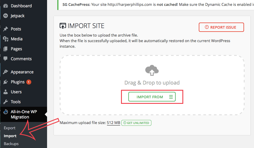 9、在新的WordPress站点上,选择“All in One WP Migration”菜单下的“Import”。