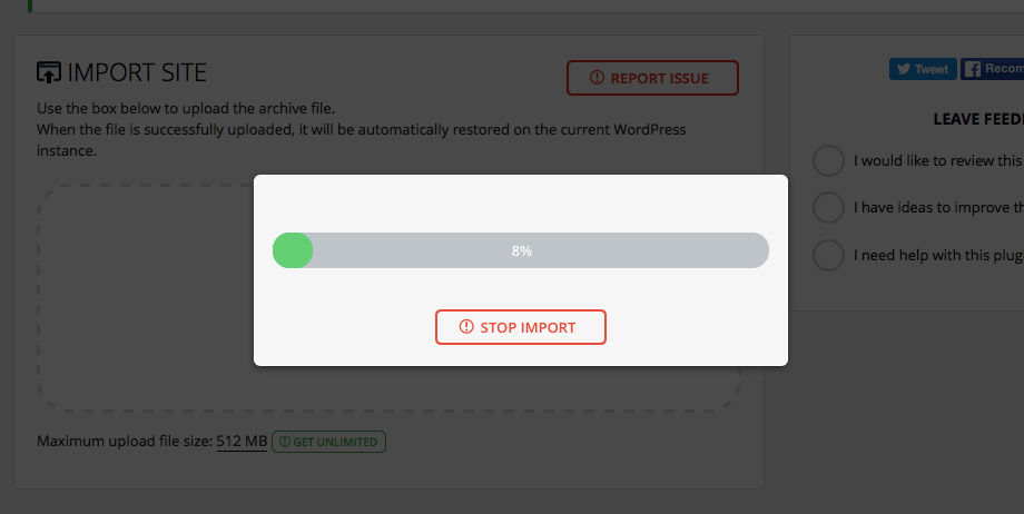 10、将从原始站点下载的.wpress文件拖到拖放窗口中以开始导入。