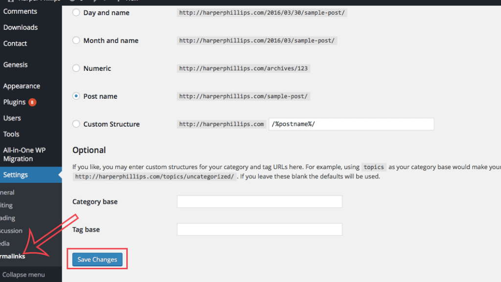 12、在左侧菜单中,选择“设置>永久链接”,然后单击“保存更改”。 无需编辑任何默认的永久链接结构信息。
